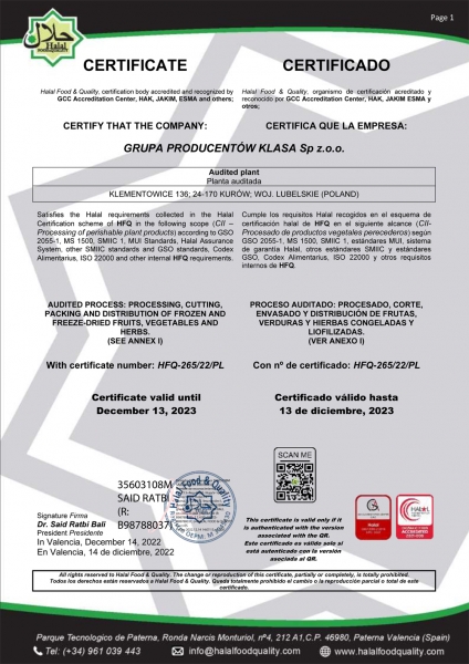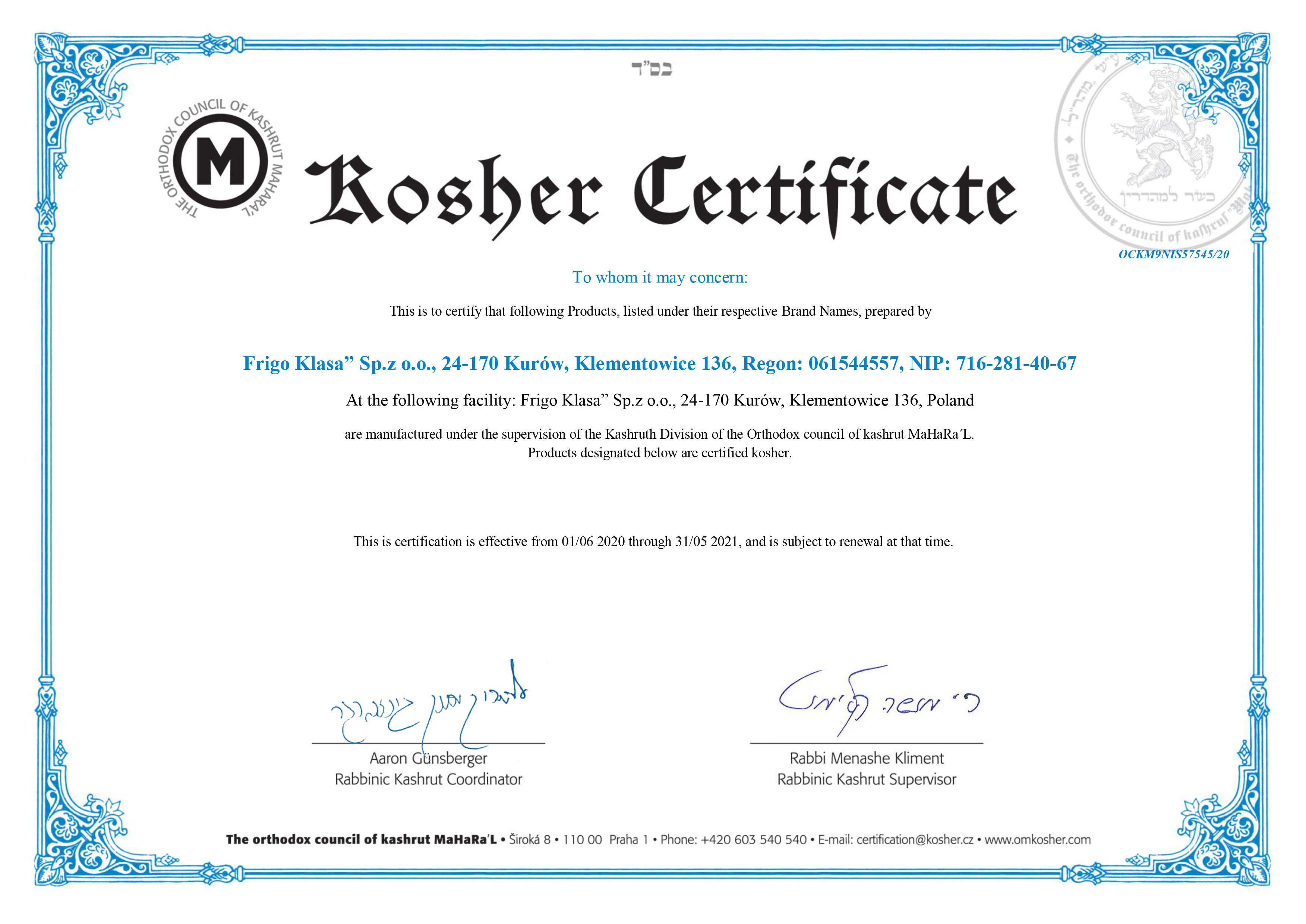 Certyfikat Kosher 2020-2021